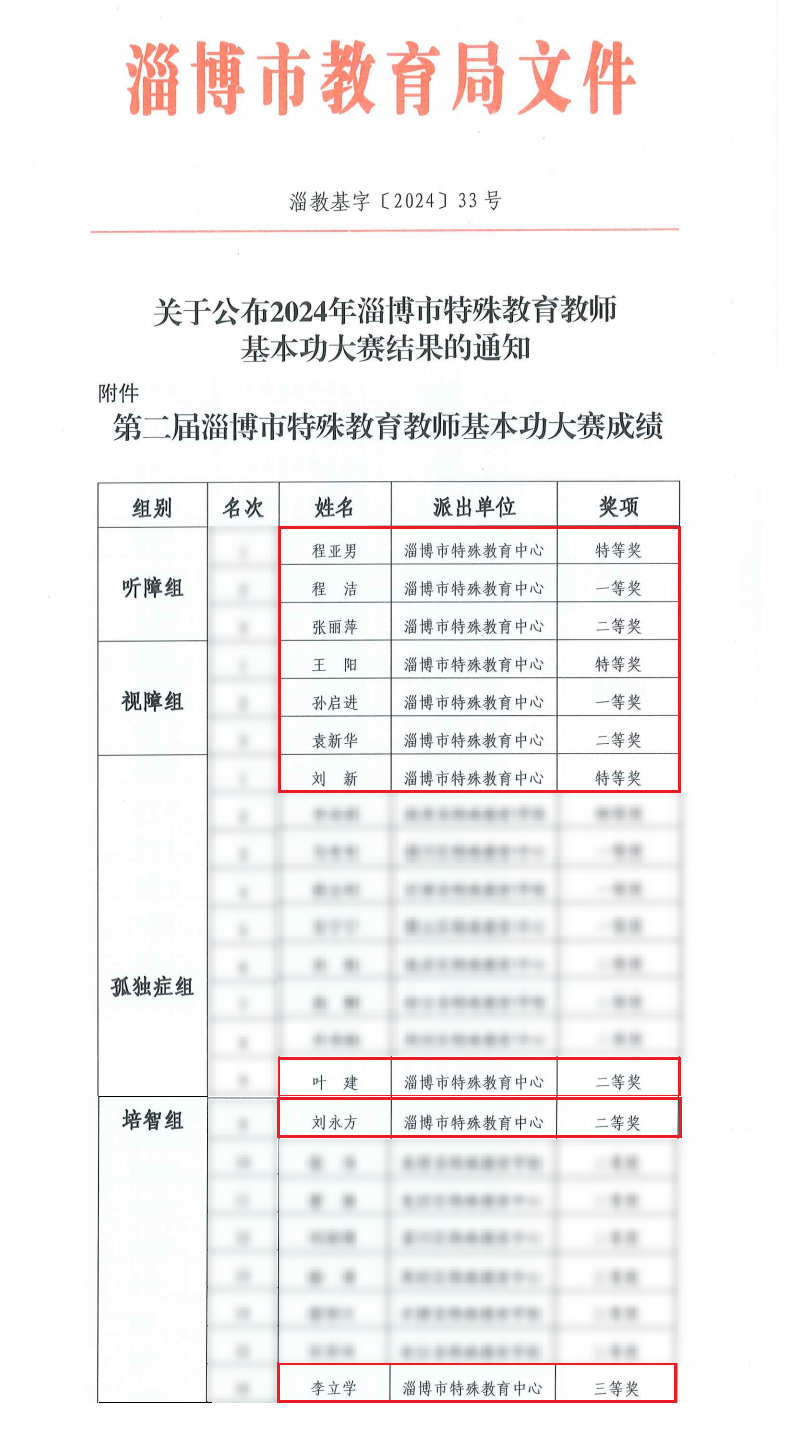 近日,淄博市教育局發(fā)布《關(guān)于公布2024年淄博市特殊教育教師基本功大賽結(jié)果的通知》(淄教基字〔2024〕33號(hào)),淄博市特教中心教師在大賽中表現(xiàn)突出,獲得喜人成績(jī)。其中程亞男、王陽(yáng)、劉新三位老師分獲聽(tīng)障組、視障組、孤獨(dú)癥組特等獎(jiǎng)并成功入圍省賽;程潔、孫啟進(jìn)兩位老師獲一等獎(jiǎng);張麗萍、袁新華、葉建、劉永方四位老師獲二等獎(jiǎng);李立學(xué)老師獲三等獎(jiǎng)。