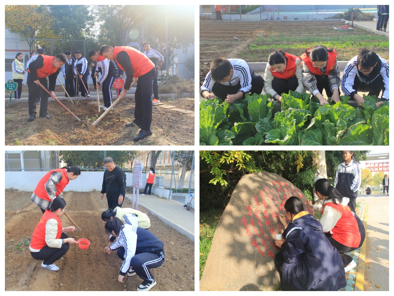學(xué)校黨委書記吳明剛對市紀委監(jiān)委一行的到來表示熱烈歡迎和衷心感謝,并簡要介紹了學(xué)校的辦學(xué)情況。在“童學(xué)”勞動教育實踐基地,志愿者們分工合作,他們拿起鐵鍬、鋤頭等工具,積極投入到種植活動中,與學(xué)生一起刨地翻土、開溝播種、捆綁白菜,忙得不亦樂乎。隨后,志愿者們一同來到博愛廣場,對“百愛”石進行了描紅,讓“愛”熠熠生輝。