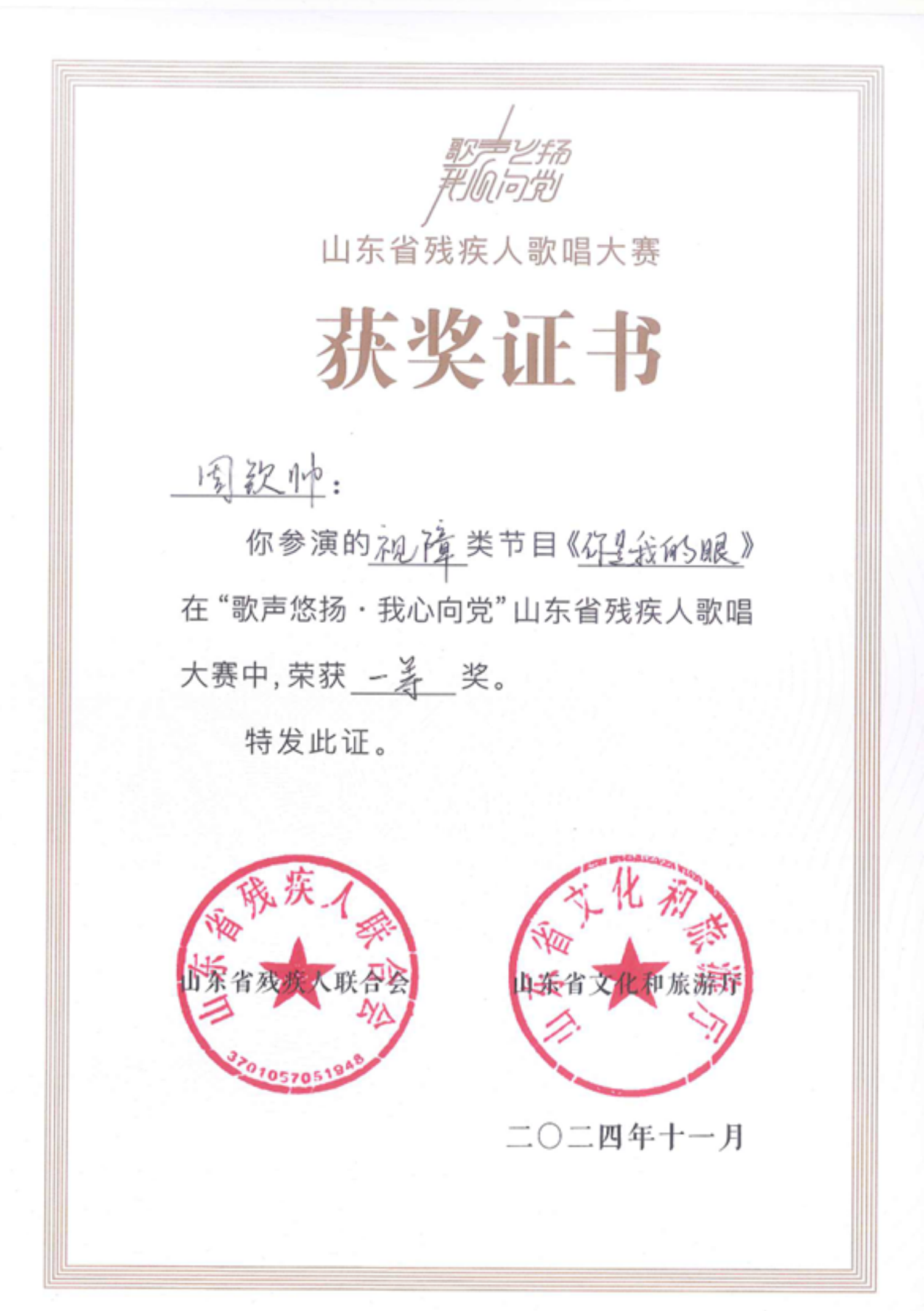 ?11月6日,由省殘聯(lián)、省文化和旅游廳聯(lián)合舉辦的“歌聲悠揚(yáng) 我心向黨”全省殘疾人歌曲大賽圓滿落幕,淄博市特殊教育中心周俊篪、周欽帥兄妹組合在本次比賽中大放異彩,演唱的歌曲《你是我的眼》榮獲視障類節(jié)目一等獎(jiǎng)第一名。