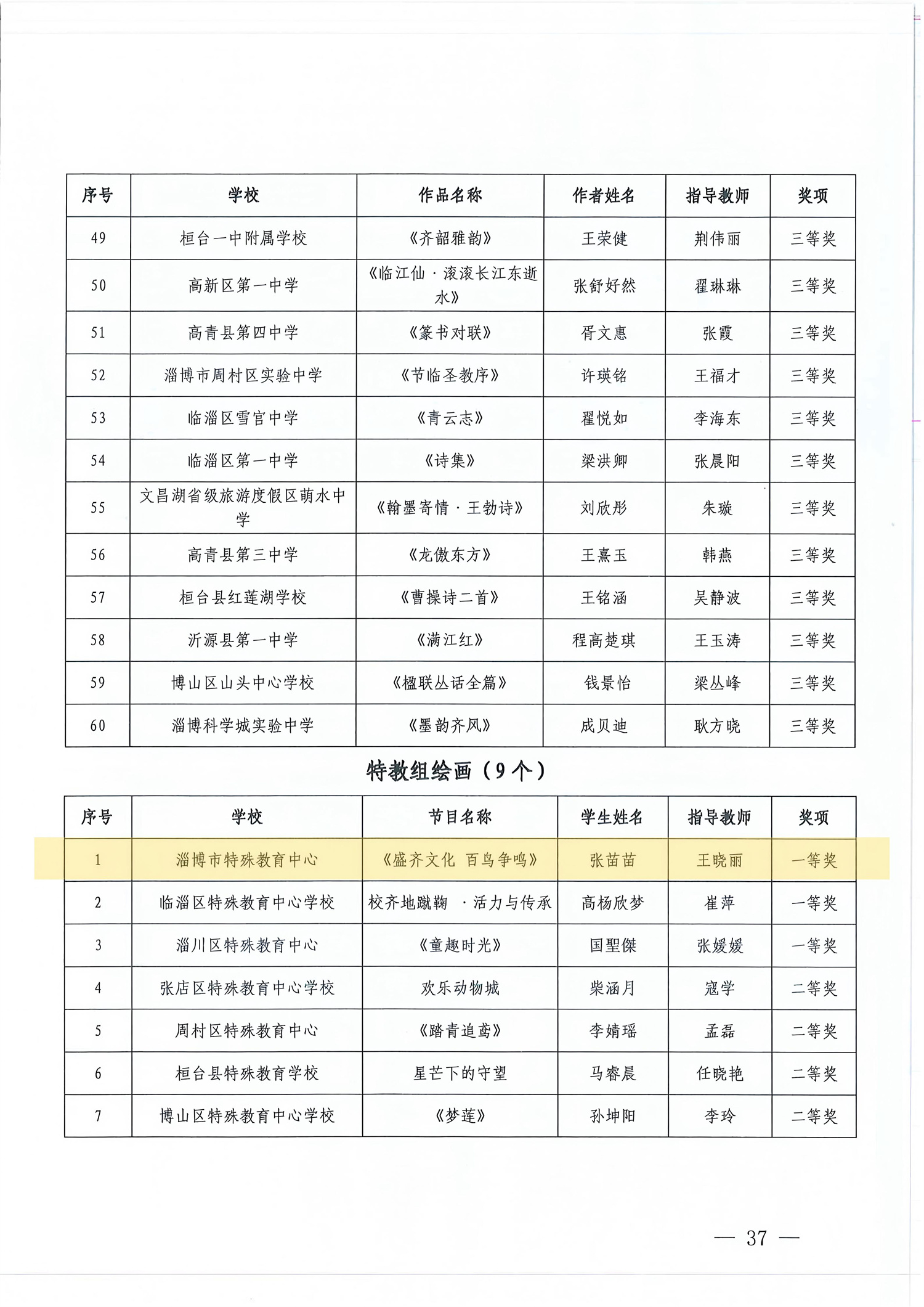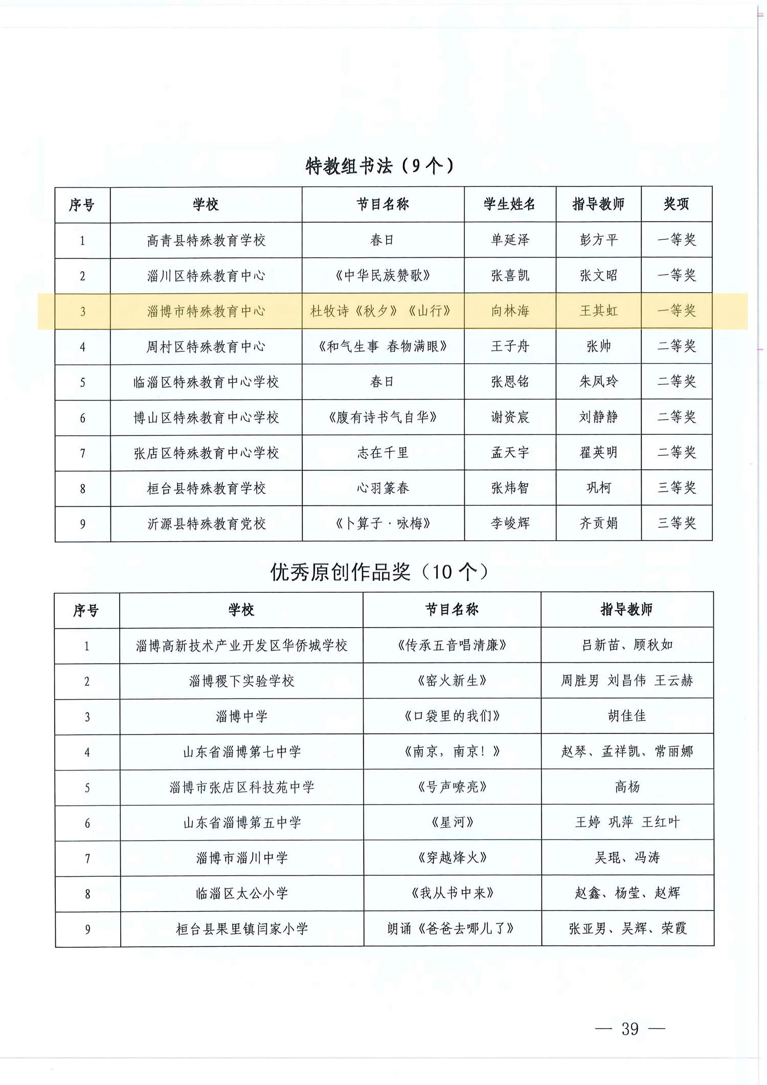 淄博市中小學生“百靈”藝術(shù)節(jié)活動每年舉辦一屆,是全市規(guī)格最高、規(guī)模最大、影響最廣的學生美育成果展示平臺。本屆活動首次專設特教組并以現(xiàn)場展演展示的形式進行了評選。學校精心選送的藝術(shù)展演類《在燦爛的陽光下》《莫扎特G大調(diào)奏鳴曲》《醉清波》3個節(jié)目、藝術(shù)作品類《盛齊文化 百鳥爭鳴》《杜牧詩<秋夕><山行>》2件作品在評選中脫穎而出,全部榮獲一等獎。創(chuàng)造了歷屆活動以來的最好成績,為學?!耙悦烙恕惫ぷ骼L就了濃墨重彩的一筆。