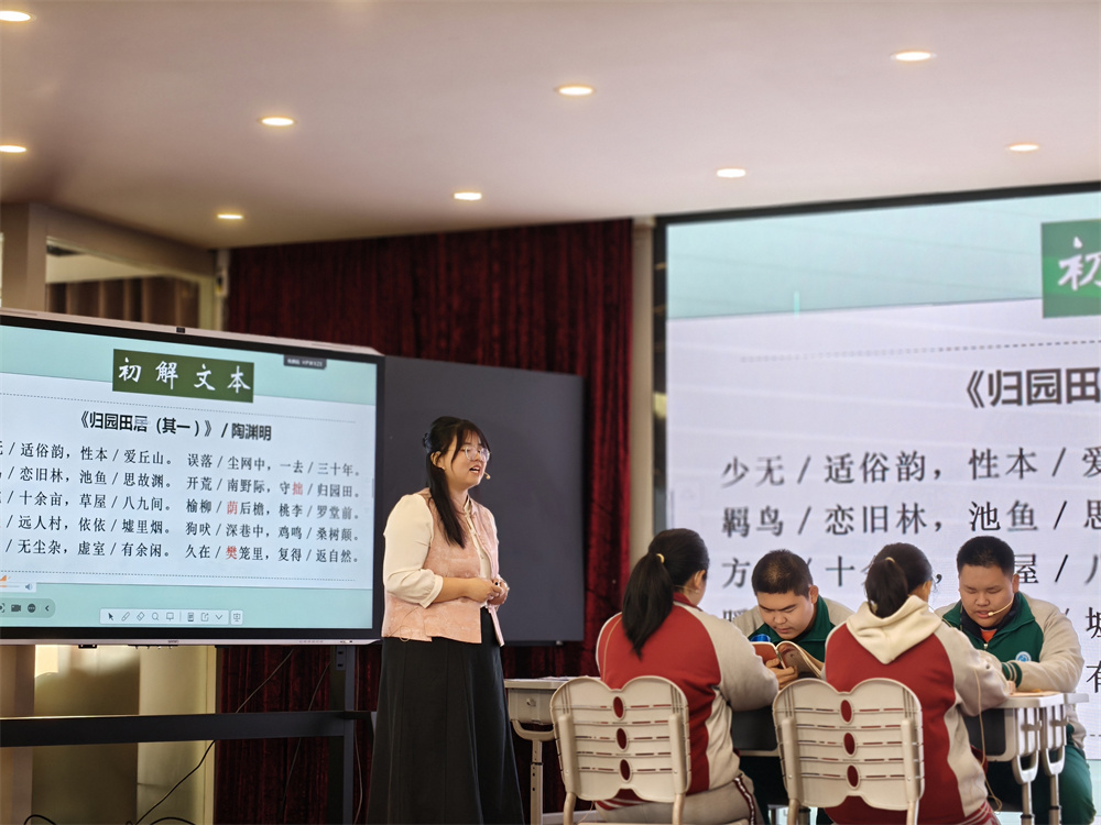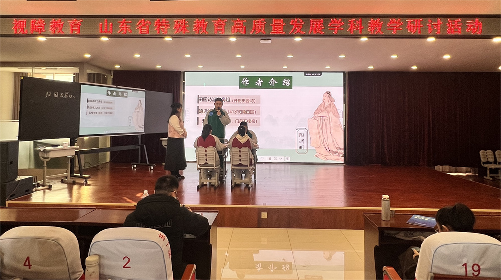 研討期間,學(xué)校王陽(yáng)老師執(zhí)教視障高中語(yǔ)文展示課《歸園田居(其一)》。課堂緊扣視障學(xué)生認(rèn)知特點(diǎn),以“數(shù)智賦能+多感官浸潤(rùn)”為核心設(shè)計(jì)教學(xué)環(huán)節(jié),通過(guò)聽(tīng)覺(jué)引導(dǎo)學(xué)生體悟詩(shī)歌節(jié)奏之美;同時(shí)巧妙融入AI技術(shù),幫助學(xué)生領(lǐng)會(huì)詩(shī)人堅(jiān)守本心的精神內(nèi)核,并結(jié)合“躺平”等現(xiàn)實(shí)話題延伸探討,實(shí)現(xiàn)文化浸潤(rùn)與價(jià)值引領(lǐng)的雙重目標(biāo),充分彰顯特殊教育的育人溫度與專業(yè)深度。課后,學(xué)校教務(wù)處負(fù)責(zé)人代表磨課團(tuán)隊(duì)分享磨課歷程,介紹團(tuán)隊(duì)立足師生反饋持續(xù)優(yōu)化教學(xué)環(huán)節(jié)的實(shí)踐,并分享了學(xué)校在視障教育數(shù)智教學(xué)領(lǐng)域的探索經(jīng)驗(yàn)。